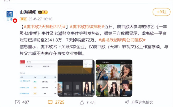 虞书欣社交平台掉粉已经达到70多万。