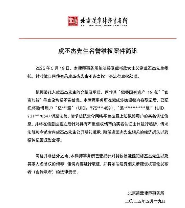 而身为父亲的虞父早在5月份就出具律师声明。
