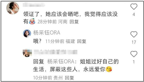 但评论区仍充满质疑声,有网友表示杨采钰如果领了结婚证应该会晒出来,她没晒应该就是没有。十多分钟后,杨采钰现身该评论区,回复了“哦?”,没有直接承认领证也没有否认,意味深长。注意看,她的IP正在福建,可能正跟男友待在一起。
