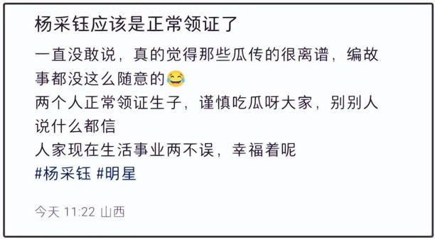 最近,杨采钰频频被传嫁豪门失败,还被质疑当了小老婆,当事人始终未回应。随后,有山西IP的网友发文称“杨采钰应该是正常领证”,不要相信那些离奇的瓜,人家幸福着呢。