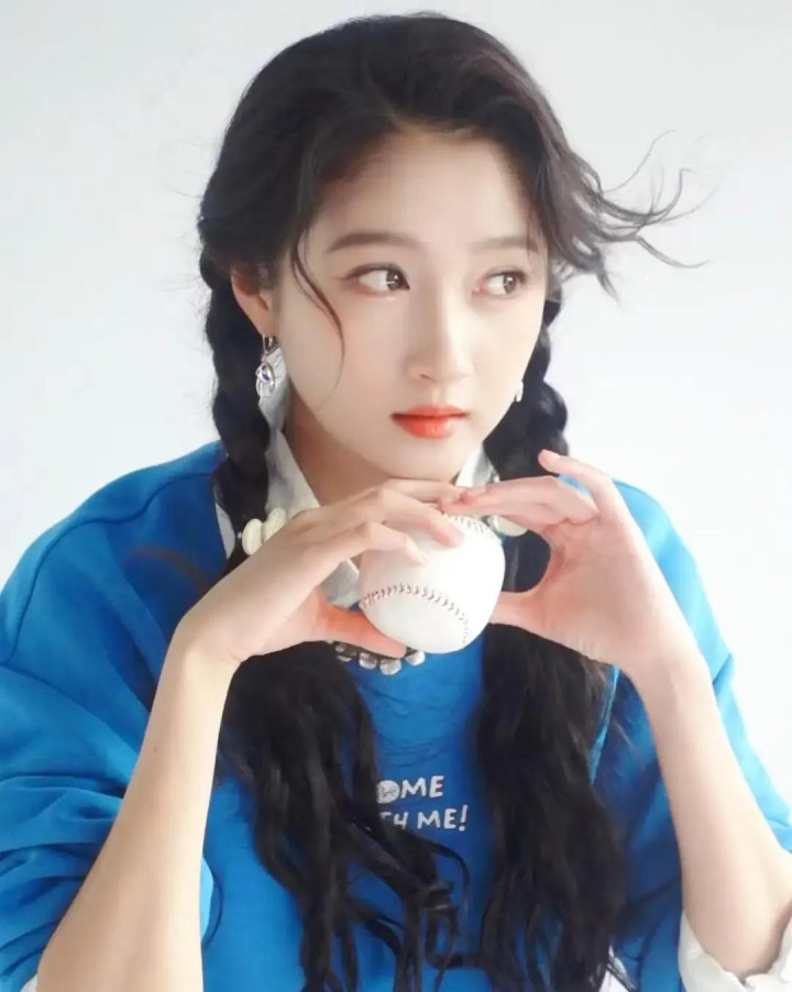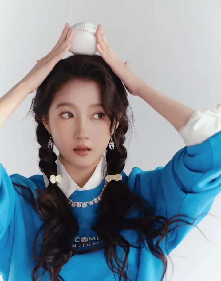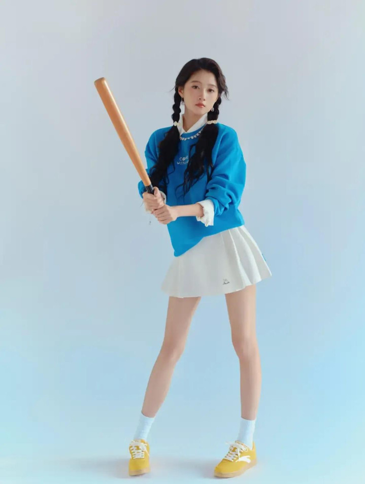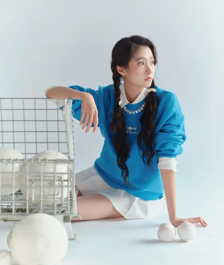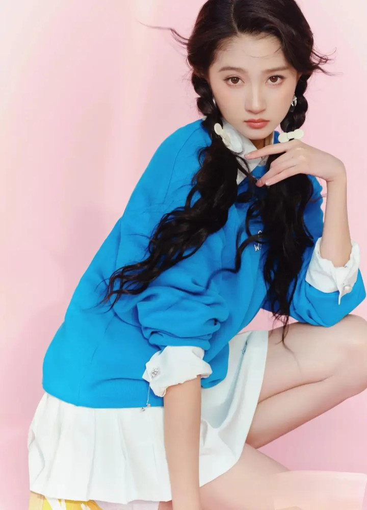 关晓彤蓝卫衣白短裙造型, 双麻花辫配运动风, 活力感拉满