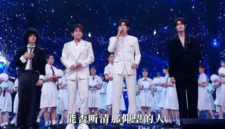 来自“两岸三地”的组合,还有苏醒、台湾省的颜人中、澳门的江新熹、香港的曾比特,他们四个人合唱了观众耳熟能详的《夜空中闪亮的星》。