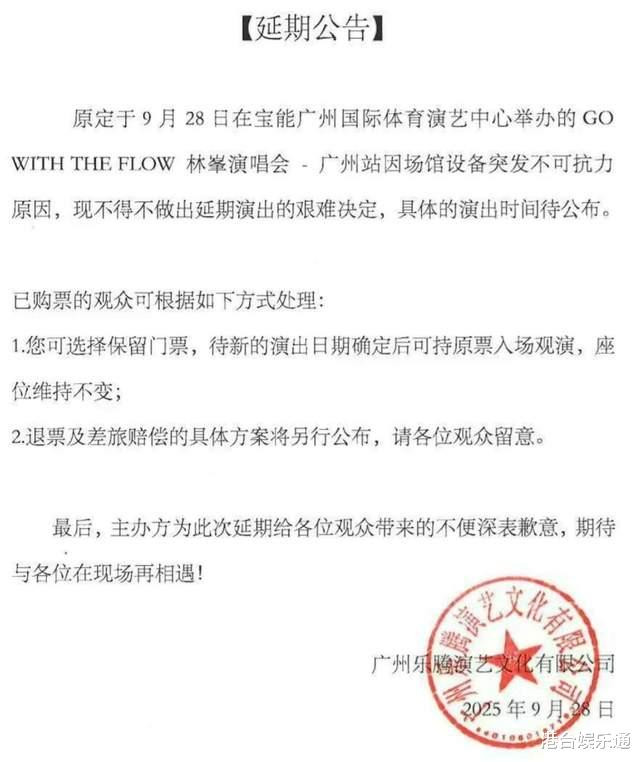 9月28日下午,林峯的巡演《GO WITH THE FLOW》广州站第二场举行前一个多小时,主办方广州乐腾演艺文化有限公司突然发布延期公告称,演出因场馆设备突发不可抗力原因而不得不延期。