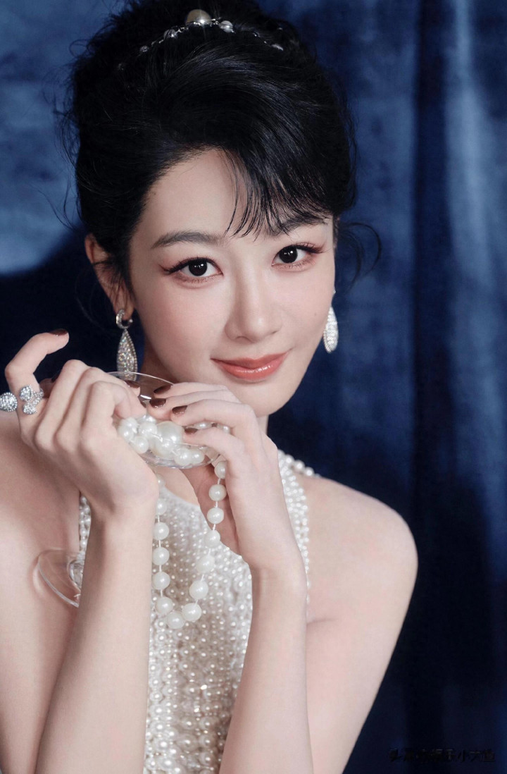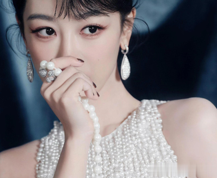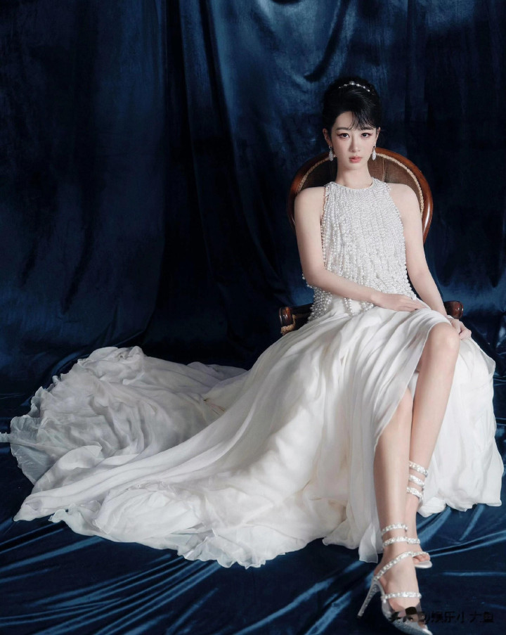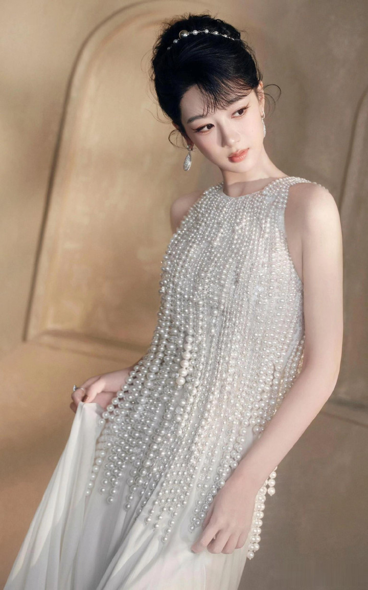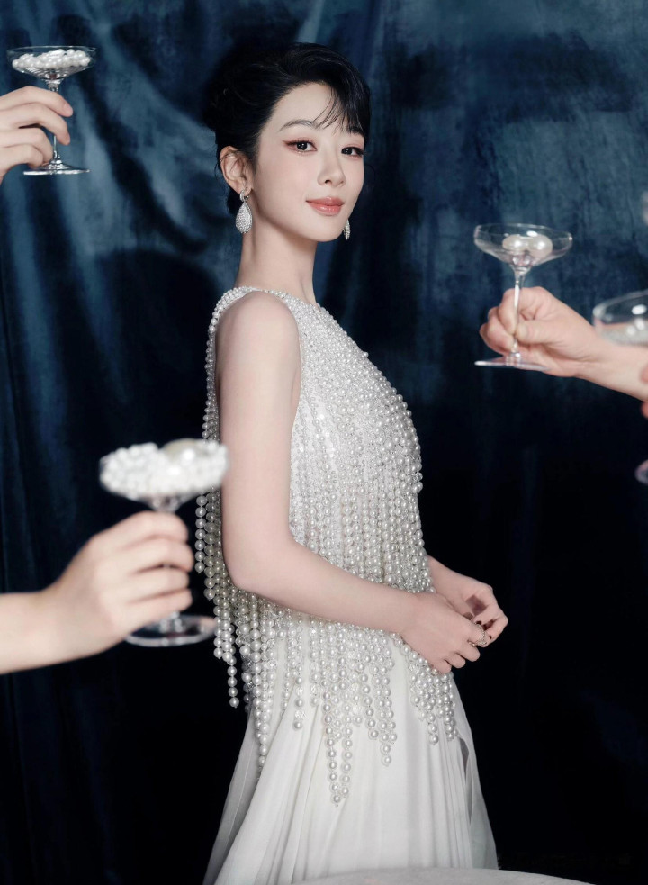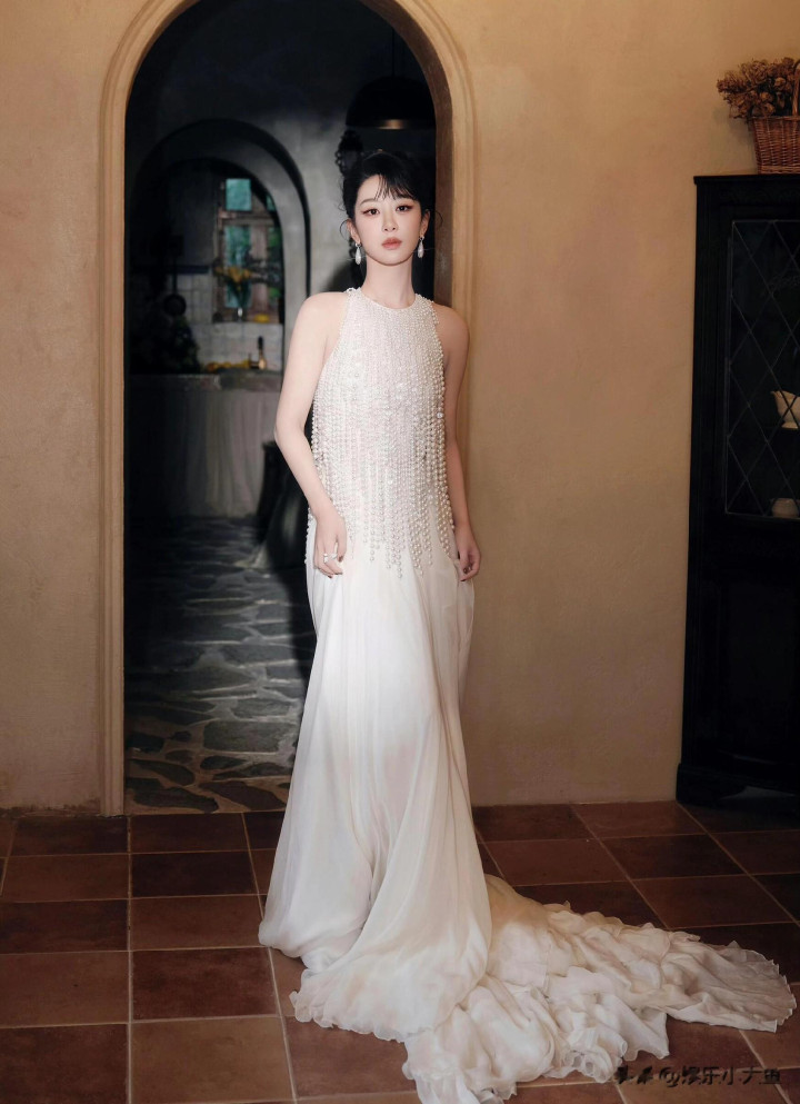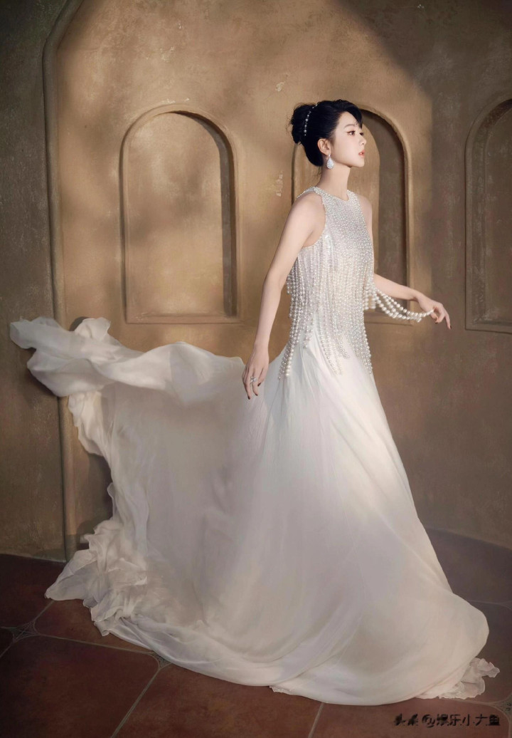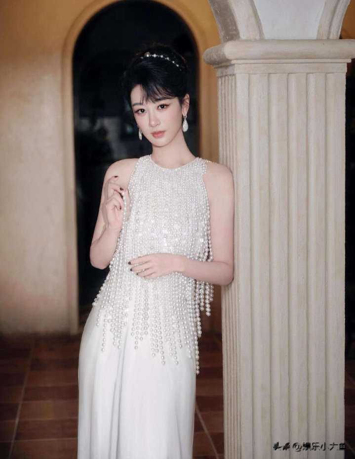 杨紫生日高定大片, 一袭珍珠流苏白裙, 盘发配珍珠耳饰美成白月光