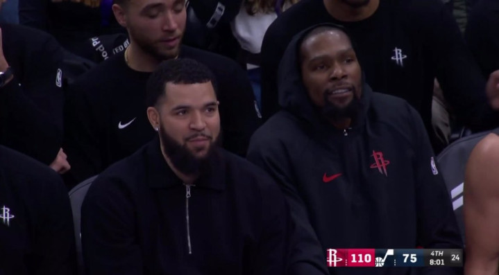 由于火箭一直大比分领先,杜兰特三节打卡下班,坐在替补席十分开心,与范弗利特轻松闲聊。