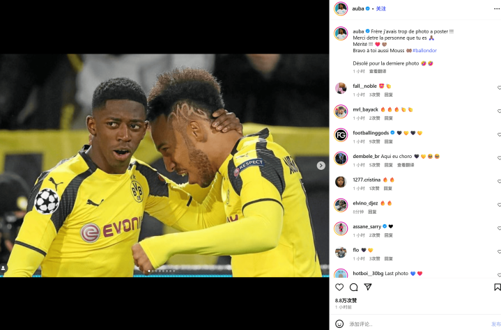 奥巴梅扬在社媒上这样写道:“兄弟,我有太多照片要发了!!感谢你现在这样的你自己!你赢得金球奖当之无愧!!”