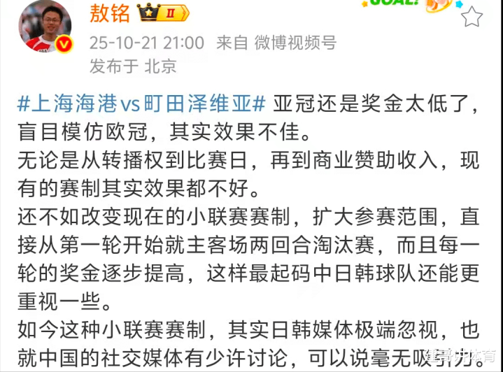 名记敖铭在点评上海海港和町田泽维亚的比赛时,认为亚冠的奖金太低了,这是盲目模仿欧冠的后果,采取这种小联赛的制度,日韩媒体已经极端忽视了,也只有中国媒体有少许讨论,根本没有吸引力。成为了鸡肋赛事的亚冠联赛,和中超联赛遇到冲突时,相信无论是哪一支中超球队,都会首选保证联赛的比赛质量的,本赛季除去上海海港外,北京国安、成都蓉城、上海申花好像也都在双线作战必须要做出选择时,都倾向选择了中超联赛。