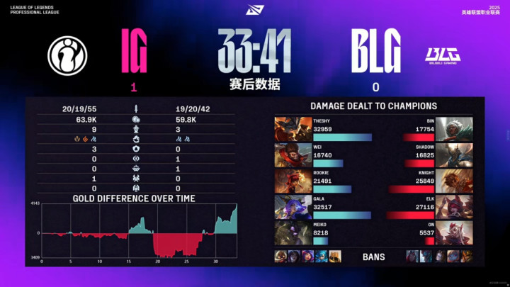 32分钟WEI入侵野区一波精彩的先手强行留人配合队友直接击杀BLG双C,一波绝杀BLG终结比赛悬念,IG战队一波强势进攻一波结束比赛,比赛用时33分钟IG与BLG打出19-19的人头比,但最后的赢家是IG。